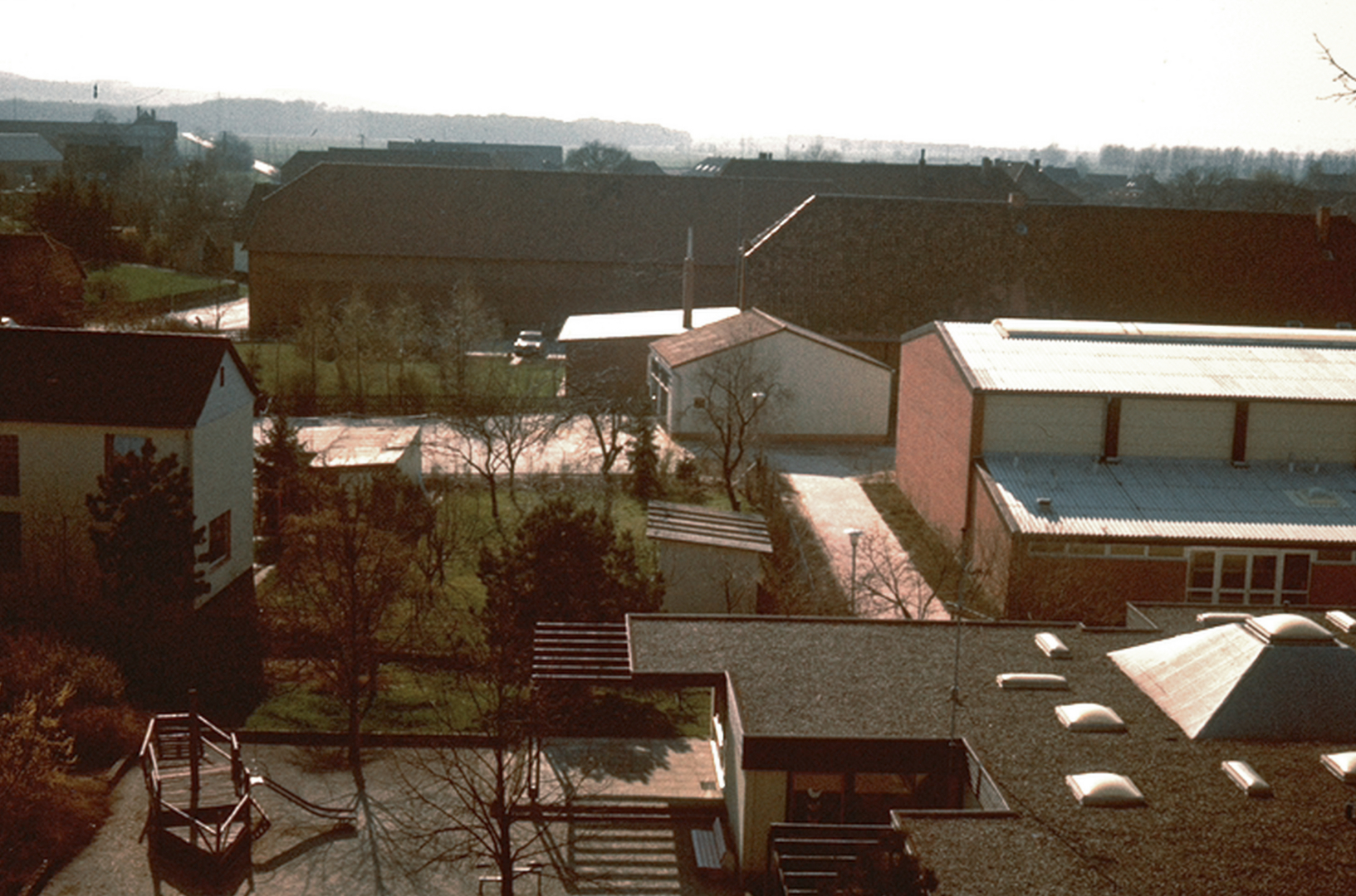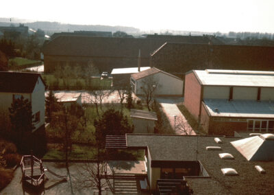 Blick vom Kirchturm auf die Mehrzweckhalle/Gerätehaus