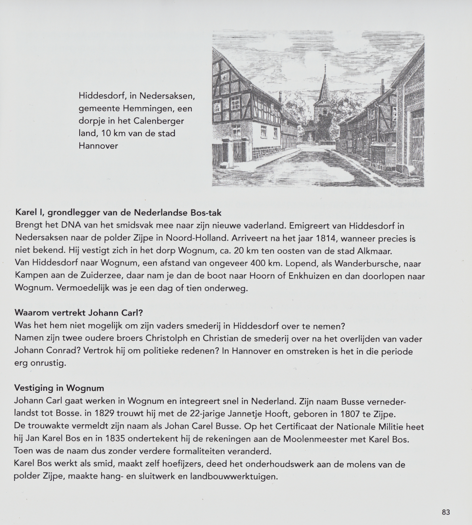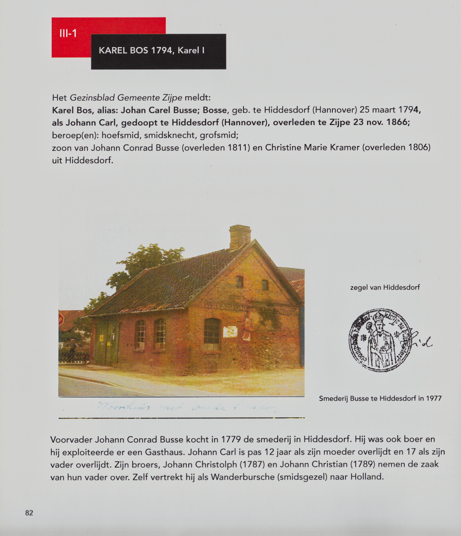 Karel Bos, alias Johan Carel Busse; Bosse geb. in Hiddestorf (Hannover) 25.März 1794 als Johann Carl, getauft in Hiddestorf (Hannover), gestorben in Zijpe 23.November 1866; Beruf: Hofschmied, Schmiedknecht, Grobschmied; Sohn von Johann Conrad Busse (gestorben 1811) und Christine Marie Kramer (gestorben 1806) aus Hiddestorf.