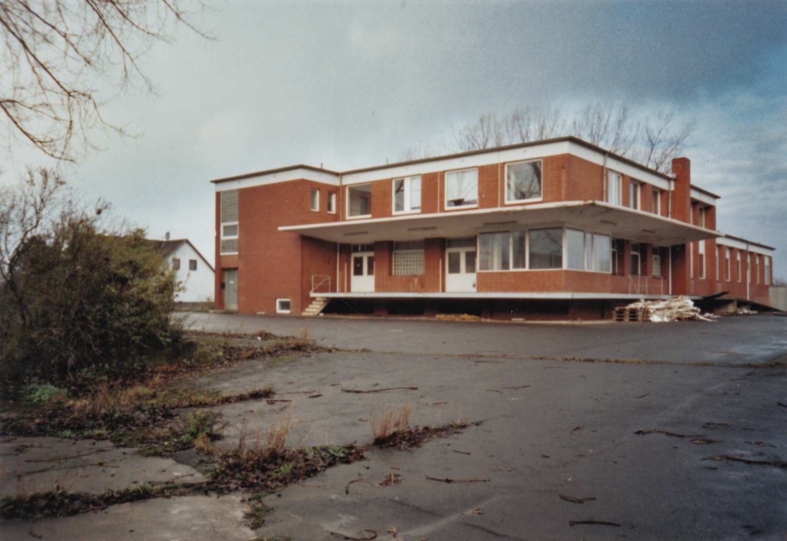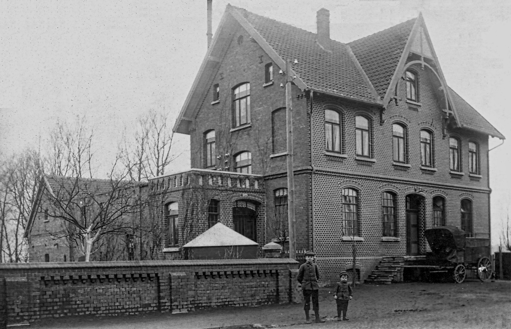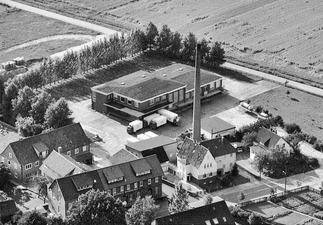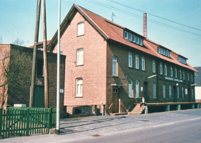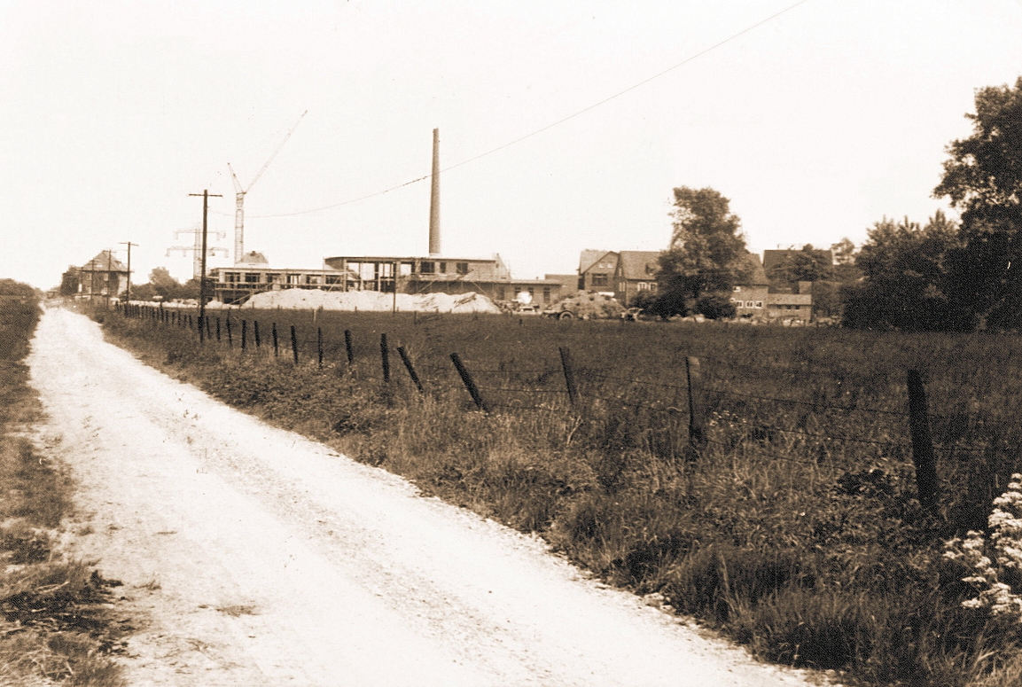 Die 2. Erweiterung in Richtung der Dorfmitte erfolgte Mitte der fünfziger Jahre und endete 1957 mit der neuen Haustür (ganz links), dem Bau der Leerguthalle (Richtung Hof) und dem Wohnungsausbau für Frau Binnewies. Das Kesselhaus mit Schornstein auf der anderen Landwehrseite wurde erst nach Kriegsende gebaut.