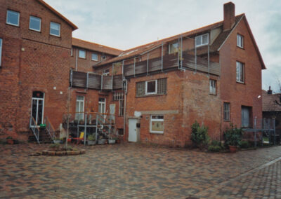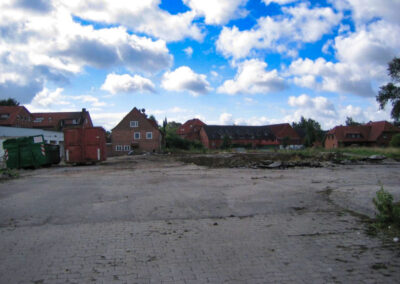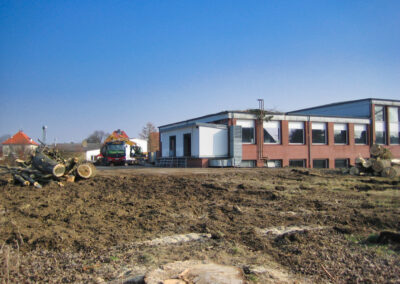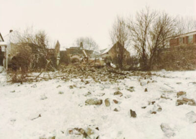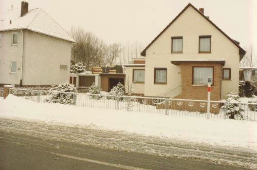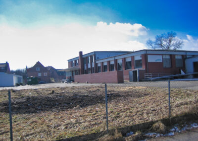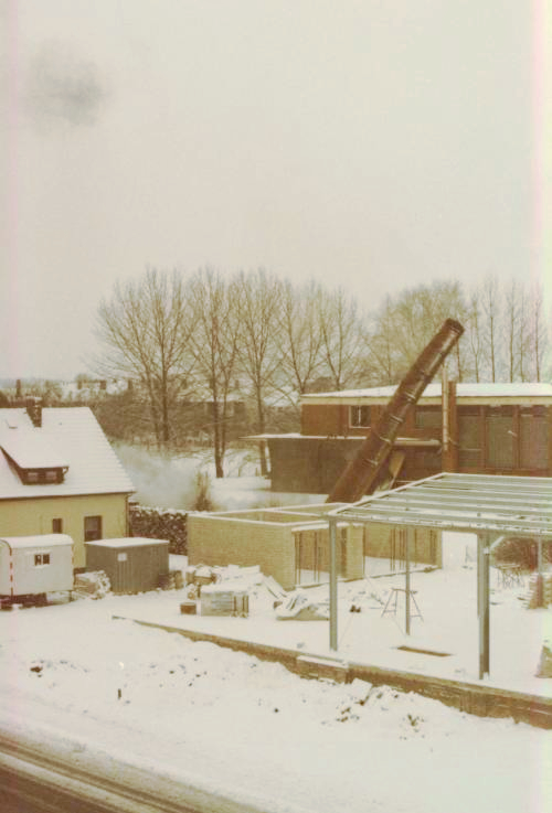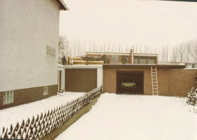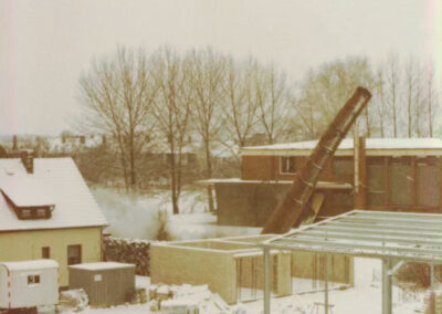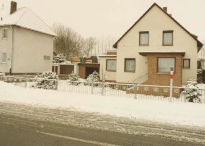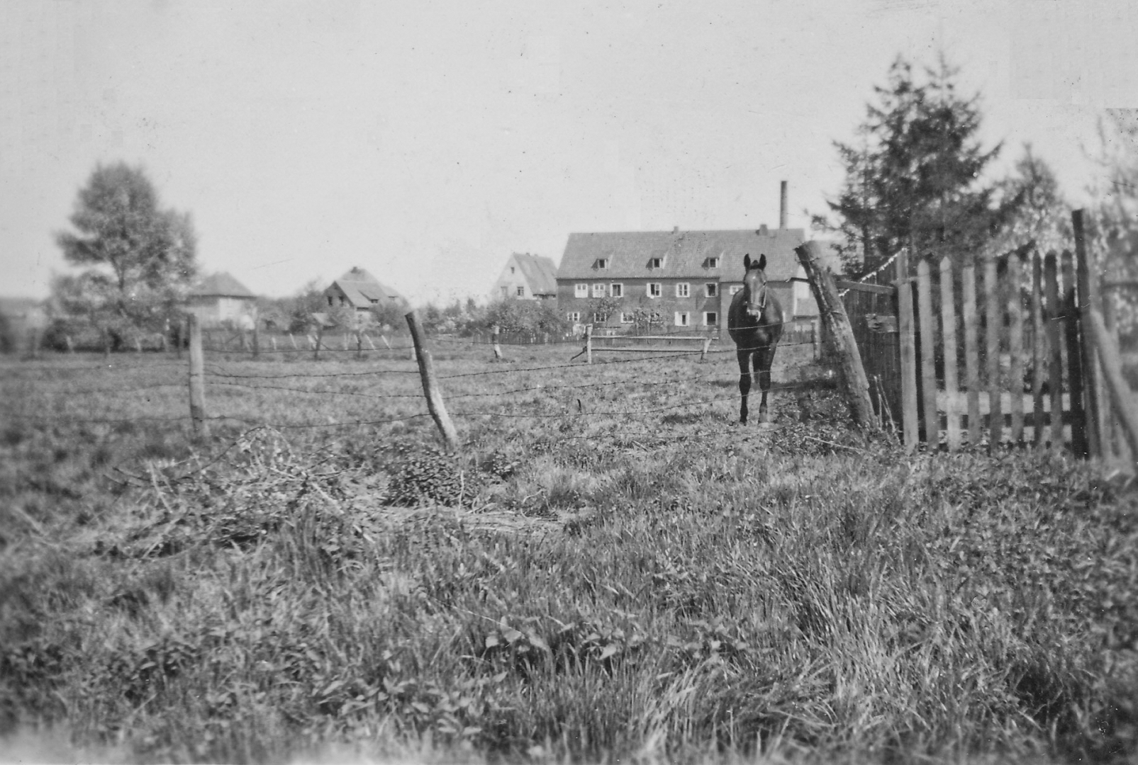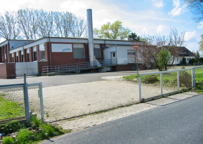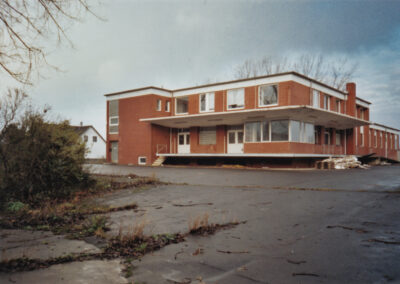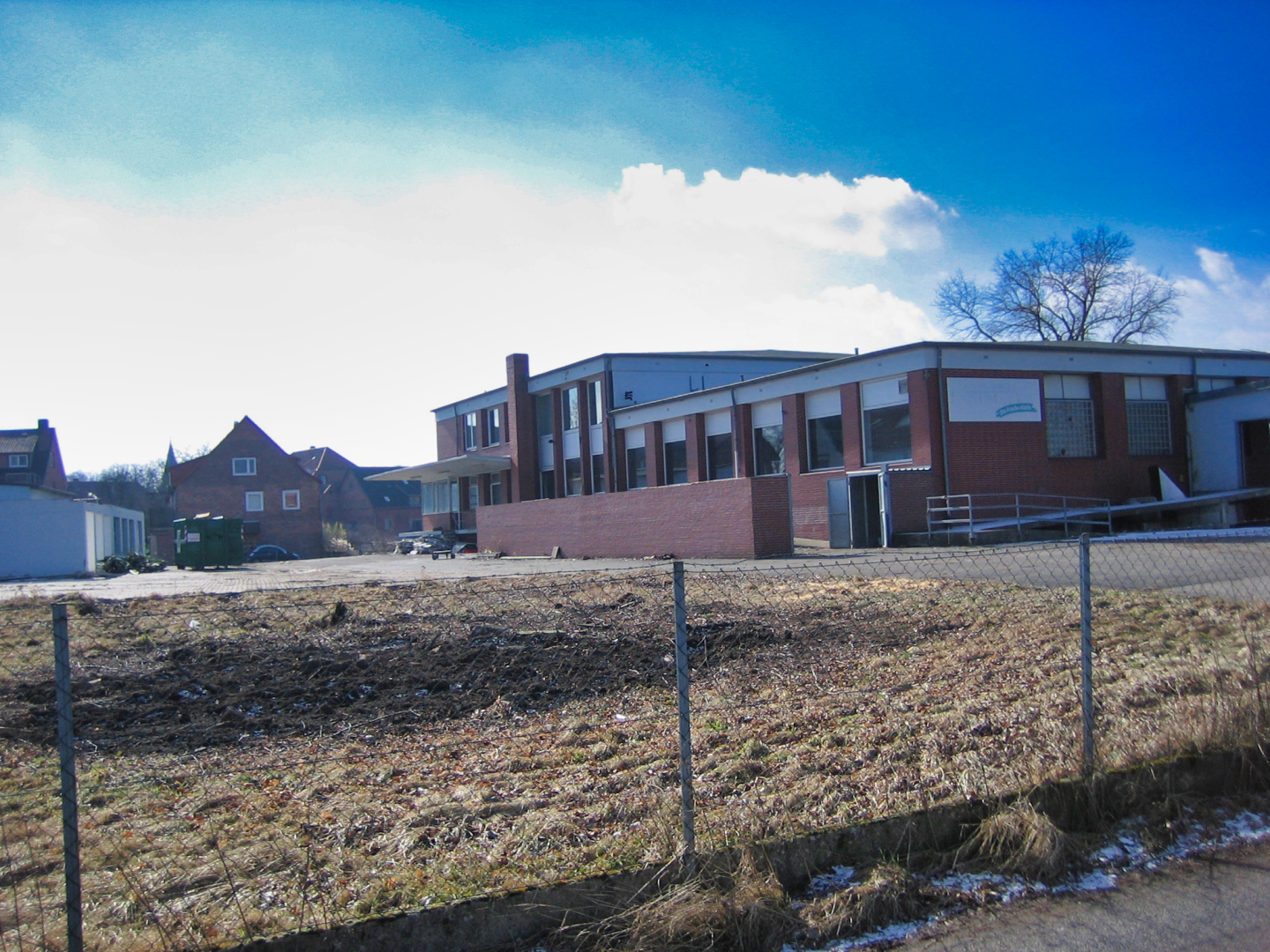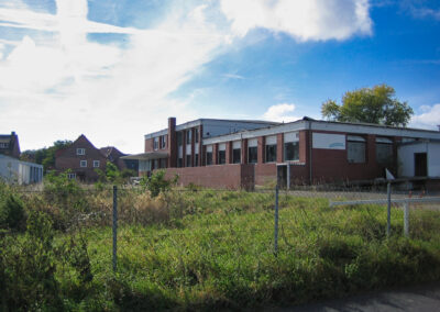 Die 2. Erweiterung in Richtung der Dorfmitte erfolgte Mitte der fünfziger Jahre und endete 1957 mit der neuen Haustür (ganz links), dem Bau der Leerguthalle (Richtung Hof) und dem Wohnungsausbau für Frau Binnewies. Das Kesselhaus mit Schornstein auf der anderen Landwehrseite wurde erst nach Kriegsende gebaut.